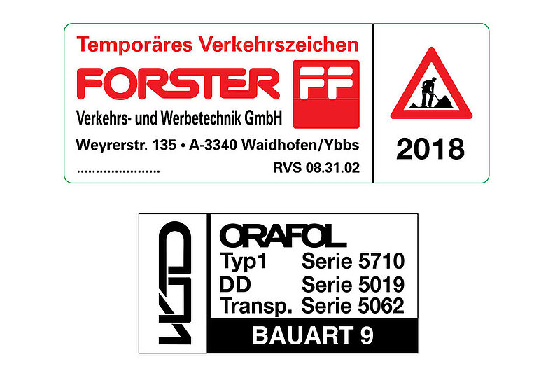 Zudem gilt seit 1. November auch eine Kennzeichnungspflicht. TVZ (Temporäre Verkehrszeichen) sind auf der Rückseite mit TVZ-Hersteller-Aufklebern sowie Bauartenaufklebern zu versehen. Durch die einheitliche Kennzeichnung aller Baustellenverkehrszeichen, kann in Zukunft leichter festgestellt werden ob das Verkehrszeichen den Prüfkriterien entspricht.