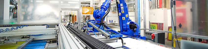 Aus einem Forschungsprojekt heraus hat sich unsere Roboprint Anlage entwickelt. Ausgangspunkt war eine hochpräzise Aufgabe – der Siebdruck von leitfähigen Schichten im Bereich des Sensordrucks sowie im Bereich des Drucks von Heizschichten, kombiniert mit strengen Prüfanforderungen an die Leitfähigkeit sowie den elektrischen Widerstand.